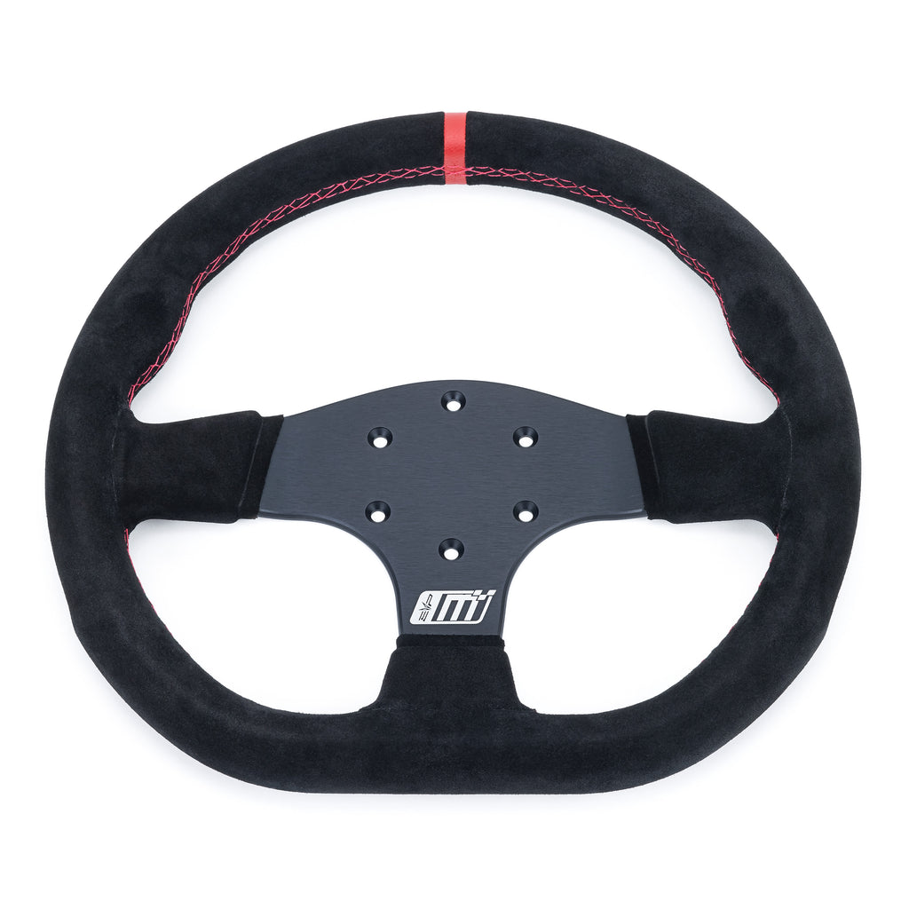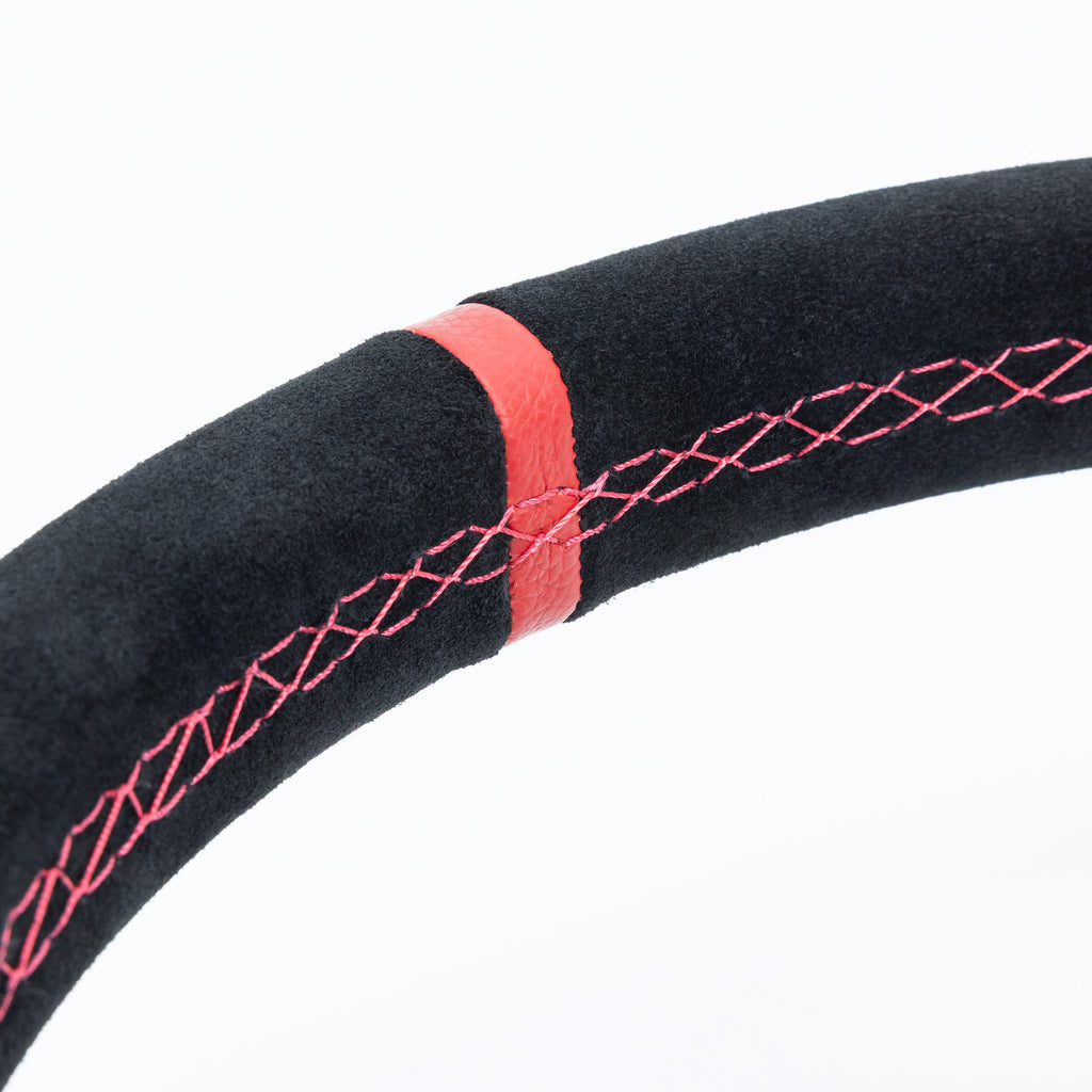 The fine Italian suede-wrapped steering wheel checks the boxes for fit, finish and feel with its ergonomic contours clocked for a confident, controlled grip. The anodized aluminum wheel also features a standard 6-lug bolt pattern compatible with most aftermarket hub adapters.