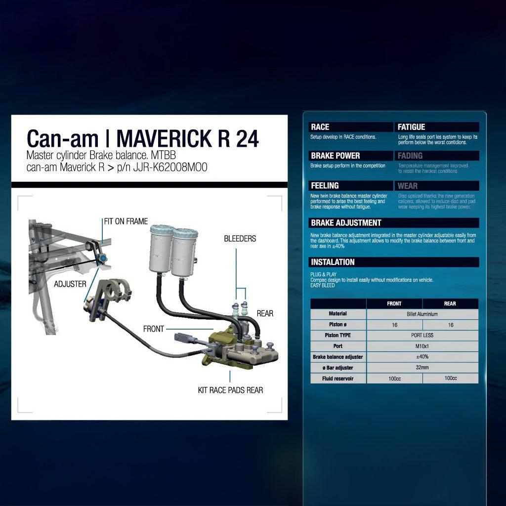 The dual master cylinder with 16mm bore size is designed for both recreational and racing applications with the Can-Am Maverick R stock brake system. The 18mm bore size is designed for high-performance racing applications equipped with aftermarket big brake kits.