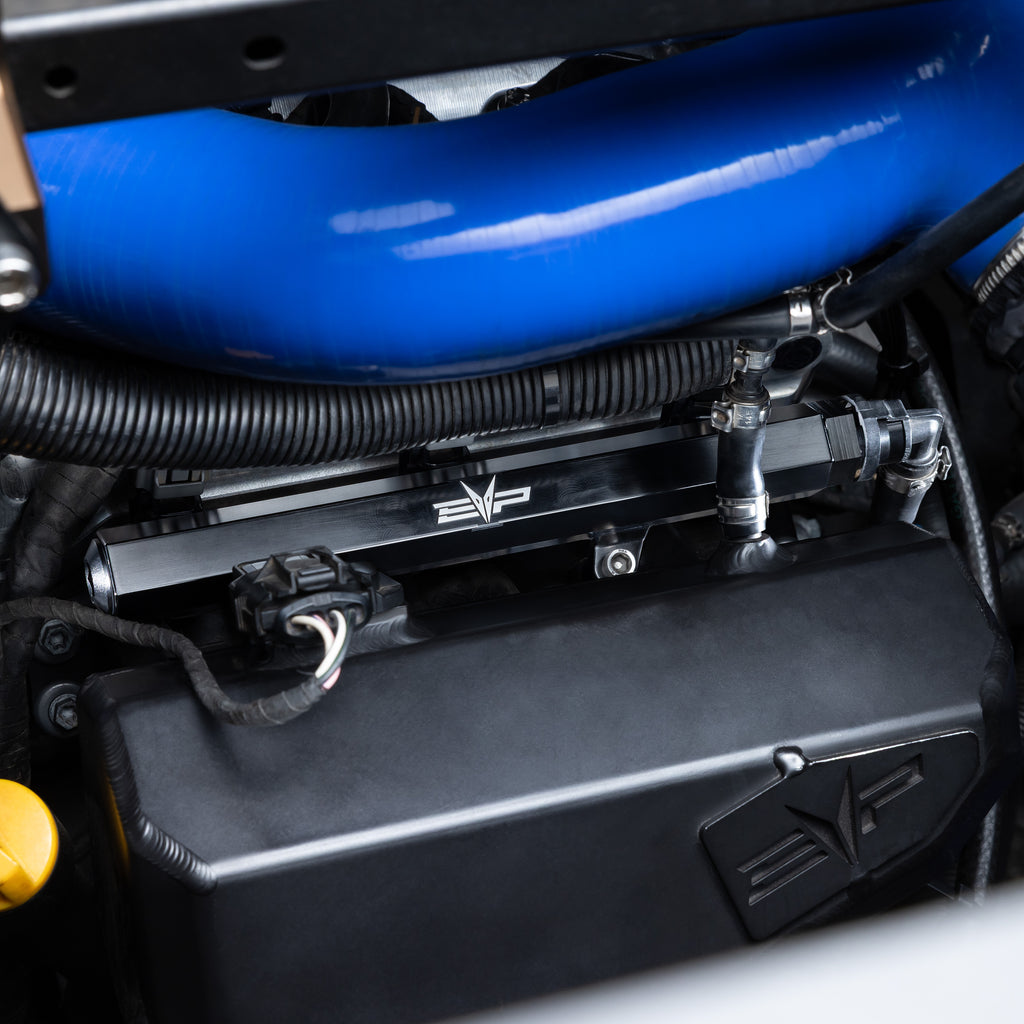 The newly redesigned Evolution Powersports Billet Fuel Rail for the Maverick X3 is another product developed through our sponsored racer program and in-house drag racing program. The new sleek design allows for ease of use, featuring a new injector clip design. In addition, it can be used as a dead head or return-style system, unlike our first design, which was only a dead head. Many racers have been looking for a replacement aluminum fuel rail to further bulletproof their vehicles when used under harsh riding conditions and racing. The OEM fuel rail is made from plastic which is no match for the strength of the EVP 6061 T6 aluminum fuel rail. The EVP fuel rail is direct replacement, no modifications needed to the inlet fitting, and can be installed in a matter of minutes.