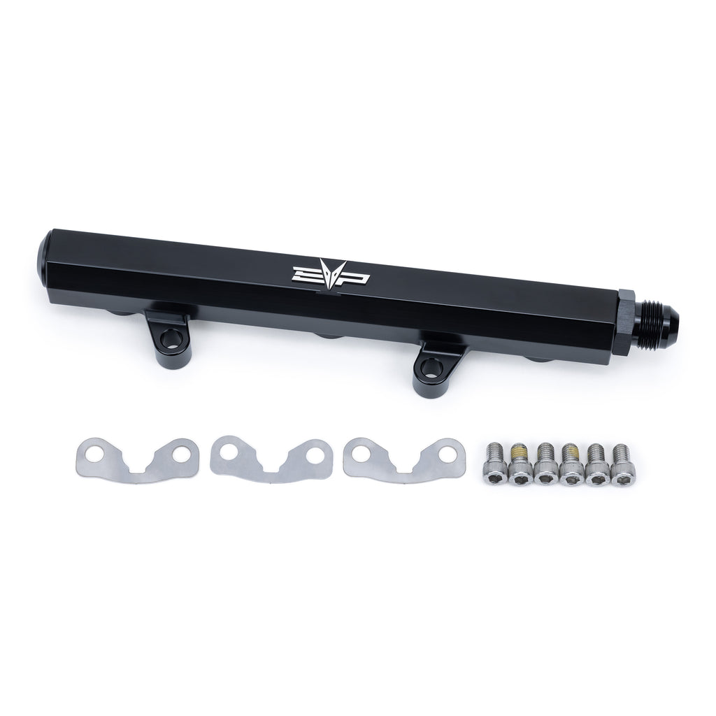 Because of the incredible power we are making in our big turbo and drag race cars, we needed a fuel rail that was adaptable to larger fuel hose and more secure AN style fittings. One of the biggest issues with the OEM fuel rail is the 5/16' supply hose and fitting. 500+ horsepower on alcohol (E85) based fuels requires a huge volume of fuel. The EVP billet fuel rail has a threaded boss so the OEM fuel hose adapter fitting can be swapped out for a -6AN o-ring boss (available separately). This allows the use of 3/8' fuel hose from the pump all the way to the rail. You can also run a return-style fuel system with this fuel rail. This will not only supply more fuel but will also lower the amp draw from the fuel pump.